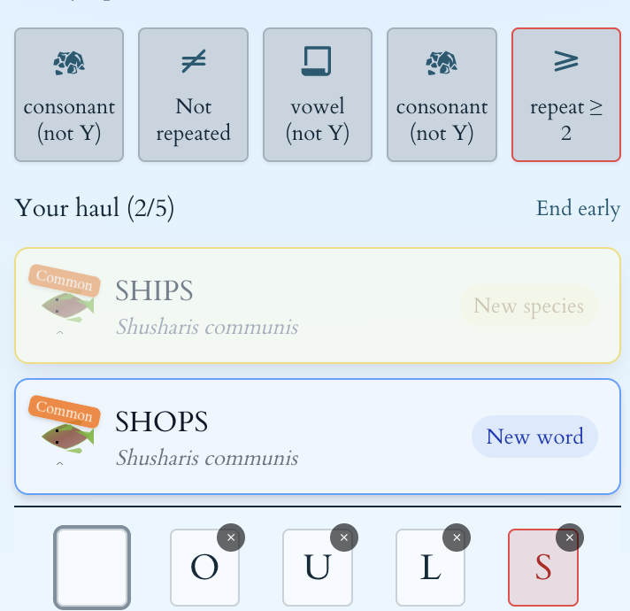 The way we compute hints may need to take into account the constraints a bit better. For example, here, the 4-letter hint '_OULS' entirely gives away the answer since the fifth letter is repeated at least twice.